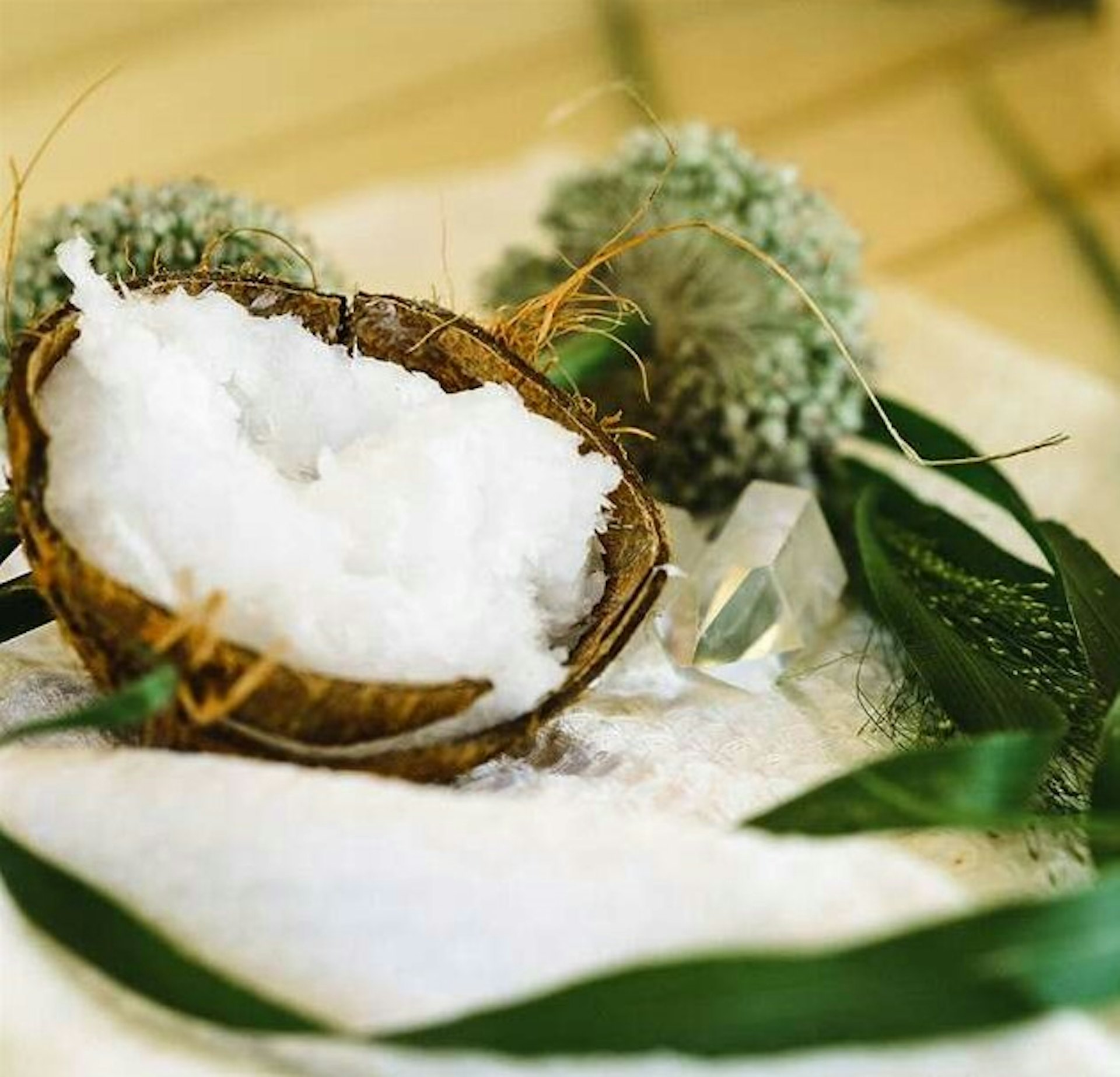 Smält kokosoljan i ett vattenbad och rör ner de andra ingredienserna. Häll i glasburk med tättslutande lock och låt den stelna.