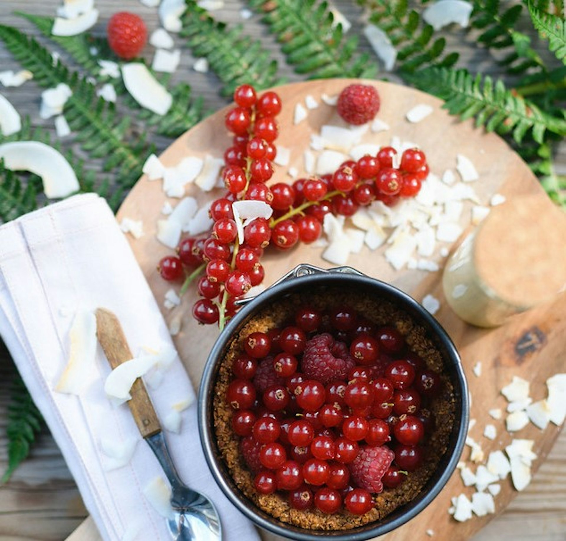 Ta ut och låt svalna. Häll i färska bär av önskad sort. Vi använde röda vinbär och hallon. Servera med glass eller vispad växtbaserad grädde.