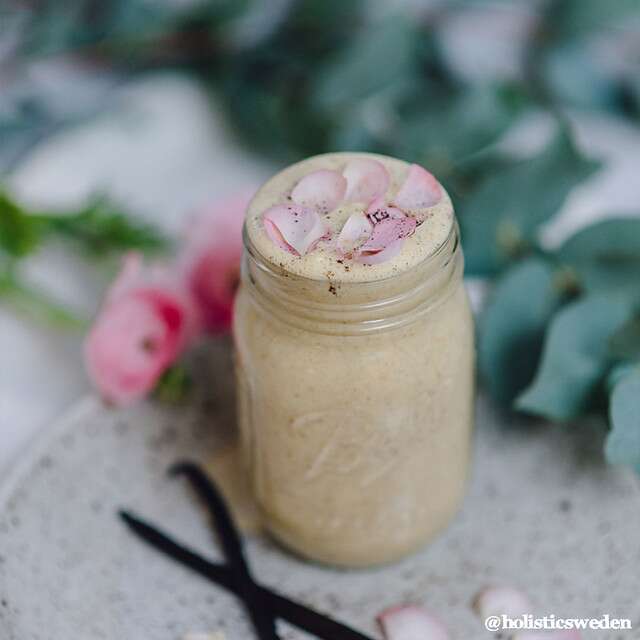 Mixa först mandlarna och vätskan tills det blir slätt. Tillsätt sedan resten av ingredienserna och mixa tills det blir slätt.