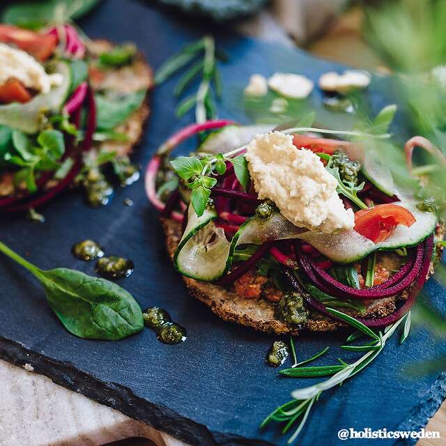 Toppa din pizza med tomatsås, pesto, cashewost och färska gröna blad.