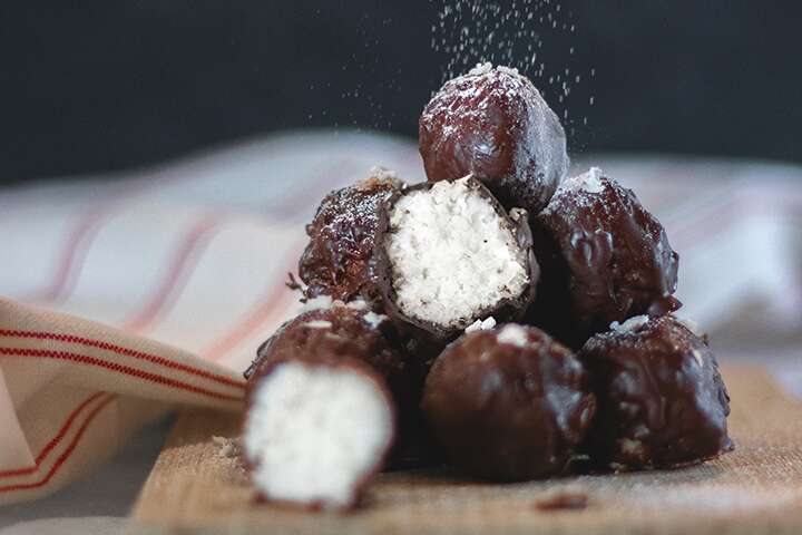 Smält kokosoljan i en kastrull och tillsätt kokosmjölk, honung och vaniljpulver. Låt det sjuda upp. Tillsätt kokosflingorna och blanda väl. Låt smeten stelna i kylen i minst en timme. Forma kokosblandningen till 15-20 st bollar och sätt in dem i frysen eller kylen i ca 30 minuter. Smält chokladen försiktigt under tiden, antingen i en kastrull eller ett vattenbad. Doppa kokosbollarna i chokladen och ställ in i frysen eller kylen för att bollarna ska kallna. Sedan är de klara att servera. Ett tips – de förvaras bäst i kylen.