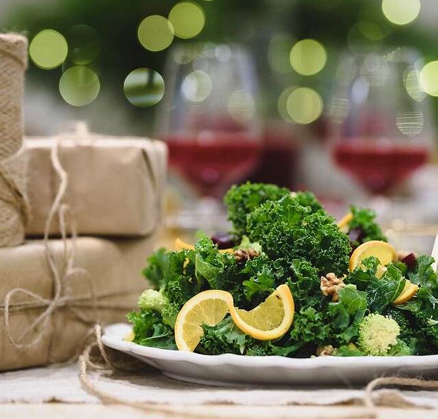 Skölj grönkålen och bryt loss bladen från stjälken. Skär små bitar av den färska broccolin och rödbetan och blanda med kålen. Toppa med filead apelsin, granatäpplekärnor och valnötter. Pressa över apelsinsaft och toppa med flingsalt.