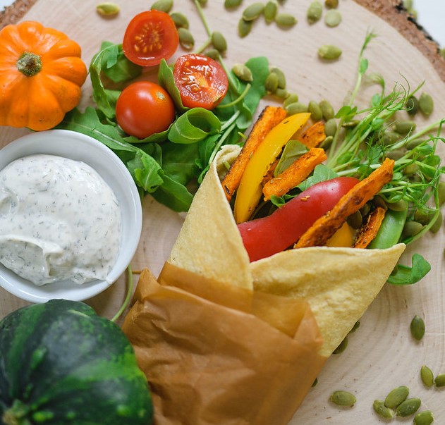 I wrapen, lägg en bädd av gröna blad samt de grönsaker du önskar. Lägg i önskad mängd rostad pumpa och toppa med dilldressingen.