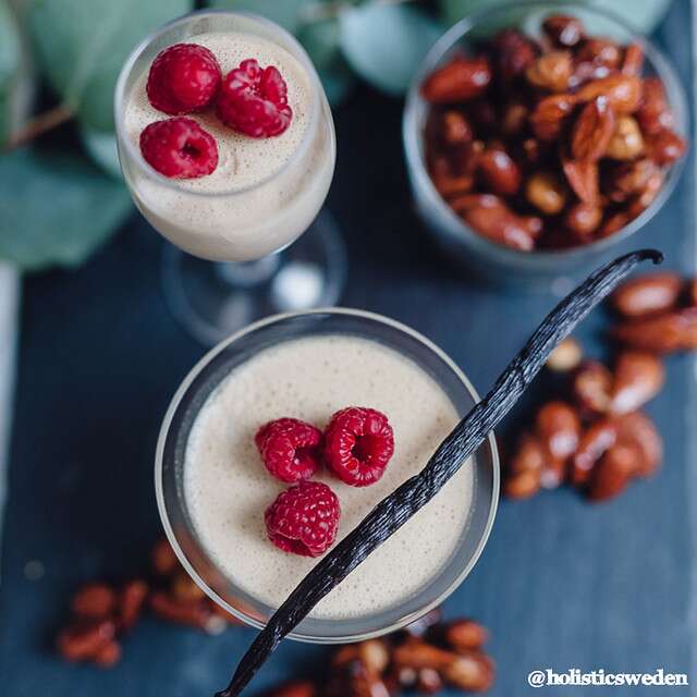 Smält kakaosmöret. Mixa alla ingredienser utan hallonen slätt. Späd med resten av kokosvattnet om det blir för tjockt. Parfaiten ska ha samma konsistens som vispad grädde. Ställ kallt och låt vila en liten stund för att kakaosmöret ska kallna och få rätt konsistens.