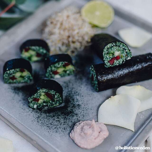 Mixa blomkålen, syrade grönsaker, ingefära och spirulina i matberedaren till riskonsistens. Smaksätt med lime och salt. Skär gurka i tunna stjälkar.