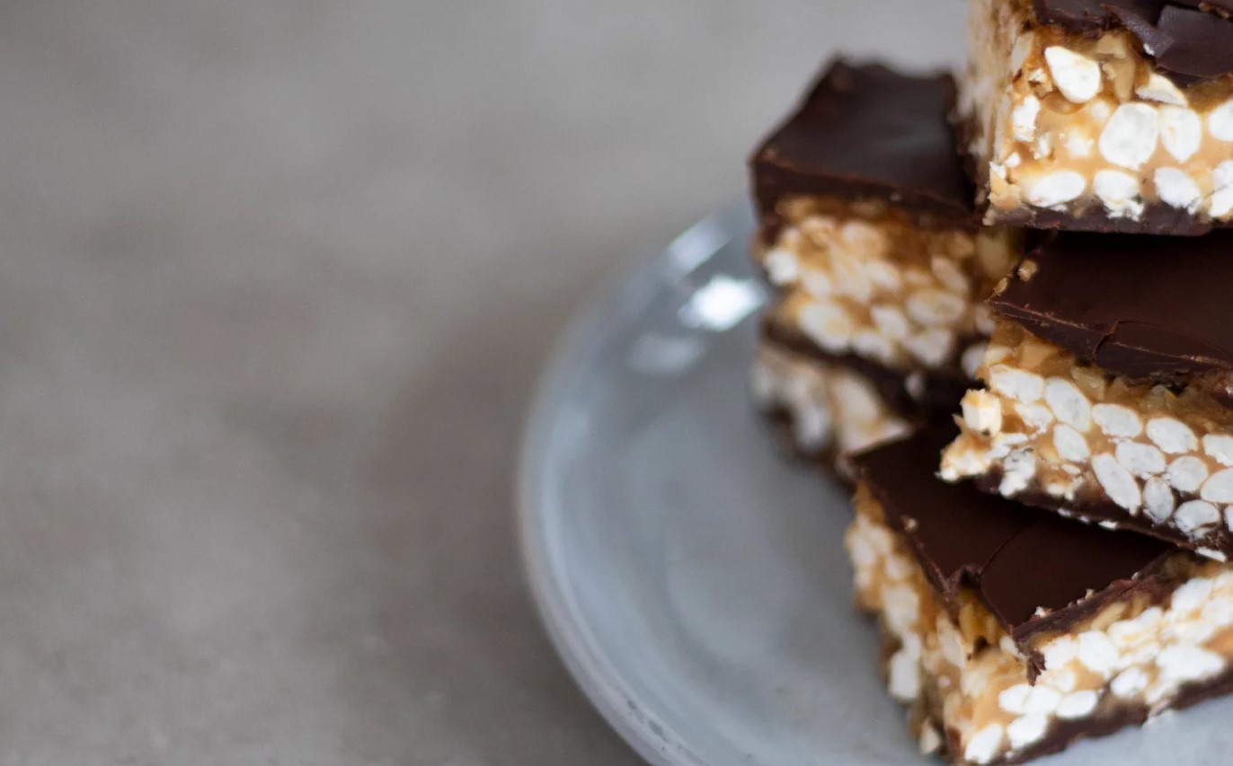 Klä en 20 cm fyrkantig bakplåt med bakplåtspapper. Tillsätt 100 g choklad och 1/2 tsk kokosolja i en liten kastrull på låg värme. När det precis har smält, ta det från värmen och häll på botten av bakformen, se till att det blir ett jämnt lager. Ställ in i frysen medan du gör riset.