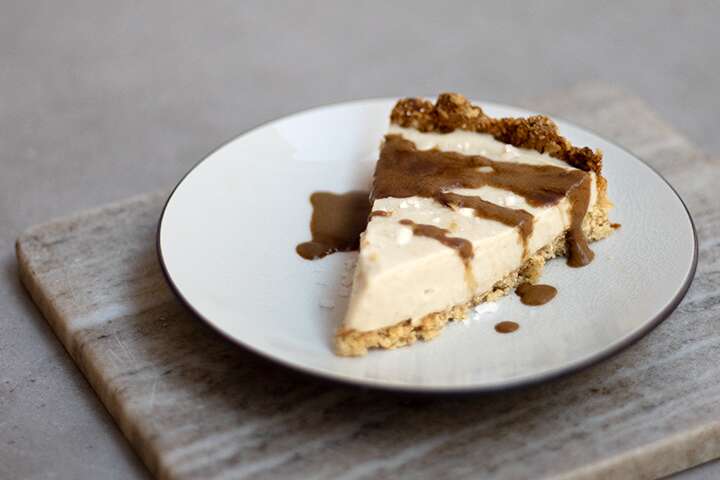 Stöt kastrullen lätt mot bänkskivan, om möjligt, för att ta bort eventuella bubblor som kan ha bildats innan du häller den i en stor värmesäker skål. Täck sedan skålen, direkt vid ytan på fyllningen, med till exempel en bivaxduk. På så sätt kan man undvika luftbubblor och att en hinna bildas. Låt den svalna i 15 minuter. Ställ den sedan i kylen i en timme. Ta ut den och vispa fyllningen tills den blir jämn igen. Häll sedan fyllningen över pajbotten. Kyl den sedan i minst två timmar. Strö över havssalt precis innan servering.